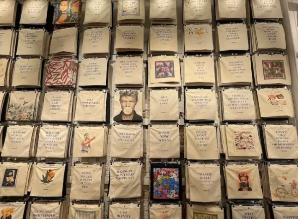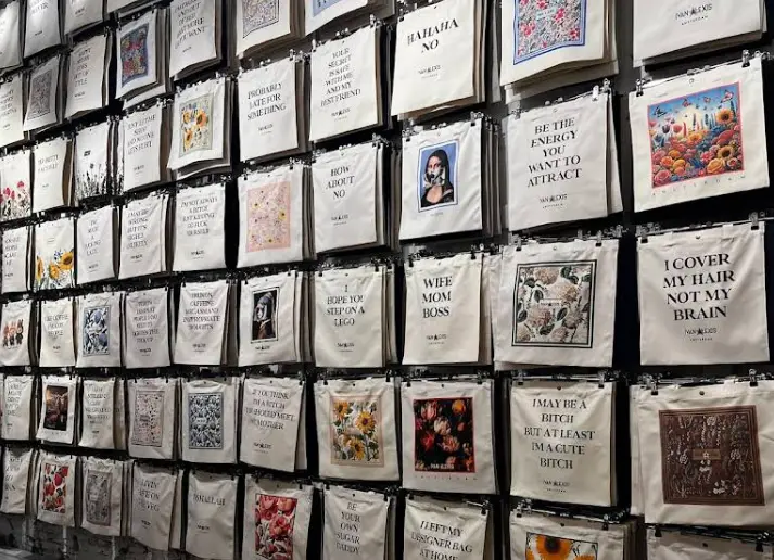 店舗では、カラフルで遊び心あるプリント入りトートバッグが並び、素材やプリントにエコなこだわり(オーガニック素材・認証インクなど)も感じられます。