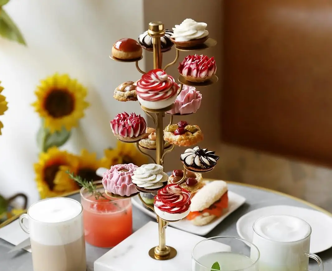 メニューはマカロンをはじめ、エクレアやタルト、季節のケーキなど多彩で、ティーセットやシャンパンとともに優雅なひとときを楽しむことができます。