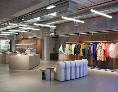 店内はミニマルでエレガントなデザインで、メンズ・ウィメンズとも美しさとトレンド感を兼ね備えたウェアが並びます。