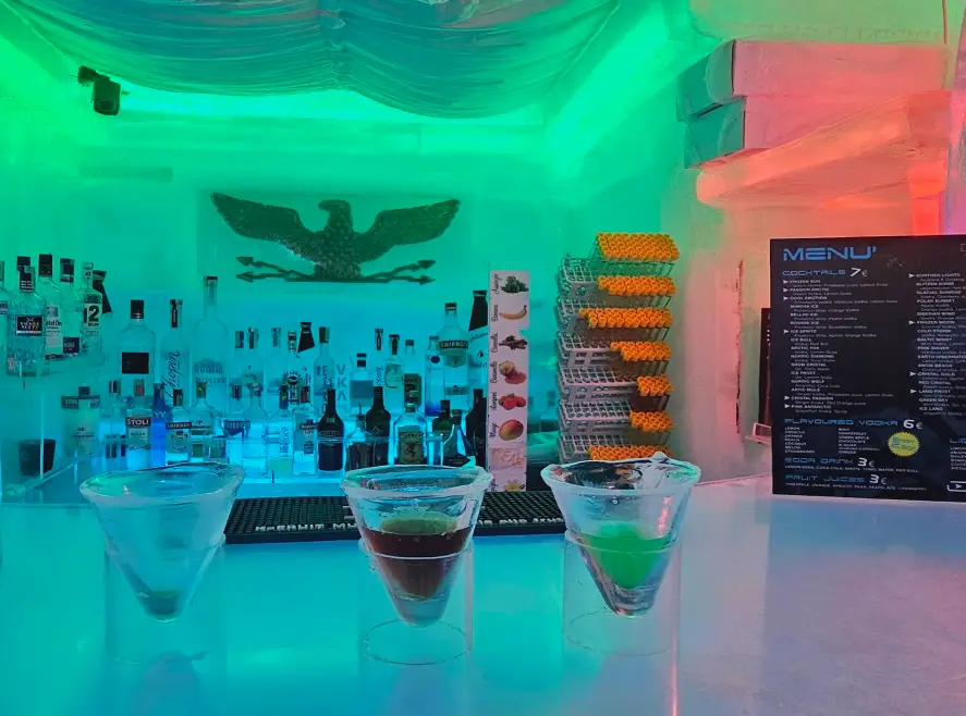 店内は氷で作られた壁や家具、さらにはグラスまでが特徴的で、まるで氷の宮殿にいるかのような非日常的な空間が広がっています。