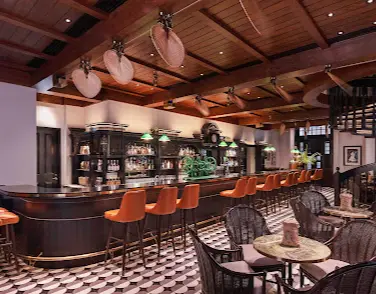 バーの内装は、植民地時代のプランテーションを思わせるデザインで、木製のカウンターや天井のファンが特徴的です。