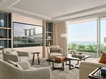 三棟の高さ約191 mホテルタワーを屋上にわたる「Sands SkyPark」でつなぎ、世界的にも目を引くインフィニティプールを持つ統合型リゾートです。ホテル内には約1850室の客室とスイートがあり、Dyson製のヘアドライヤーやワイヤレス充電対応、75インチテレビなど最新設備が整っています。SkyParkには150mのプールやレストラン、バー、展望デッキがあり、ガーデンズ・バイ・ザ・ベイやマリーナ湾を見渡せます。他に40階以上のショップや80以上の飲食店、ランドマーク的なカジノ、シアター、アートサイエンスミュージアムなどが敷地内に揃っています。また、MICE施設も充実し、会議・展示コンベンション需要にも対応しています。チェックインからチェックアウトまでをアプリで管理できる点や、ホテル専用ではないと入場できないSkyParkの運営体制も含め、都市型高級リゾートと機能性を兼ね備えた魅力があります。