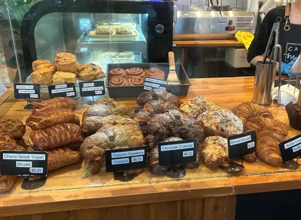 朝早くから開いていて、焼きたてのペストリーやクロワッサン、シナモンロールといった定番が揃い、サンドイッチや軽食も用意されていて、ちょっと小腹を満たしたいときや朝の散歩の途中に立ち寄るのに最適です。